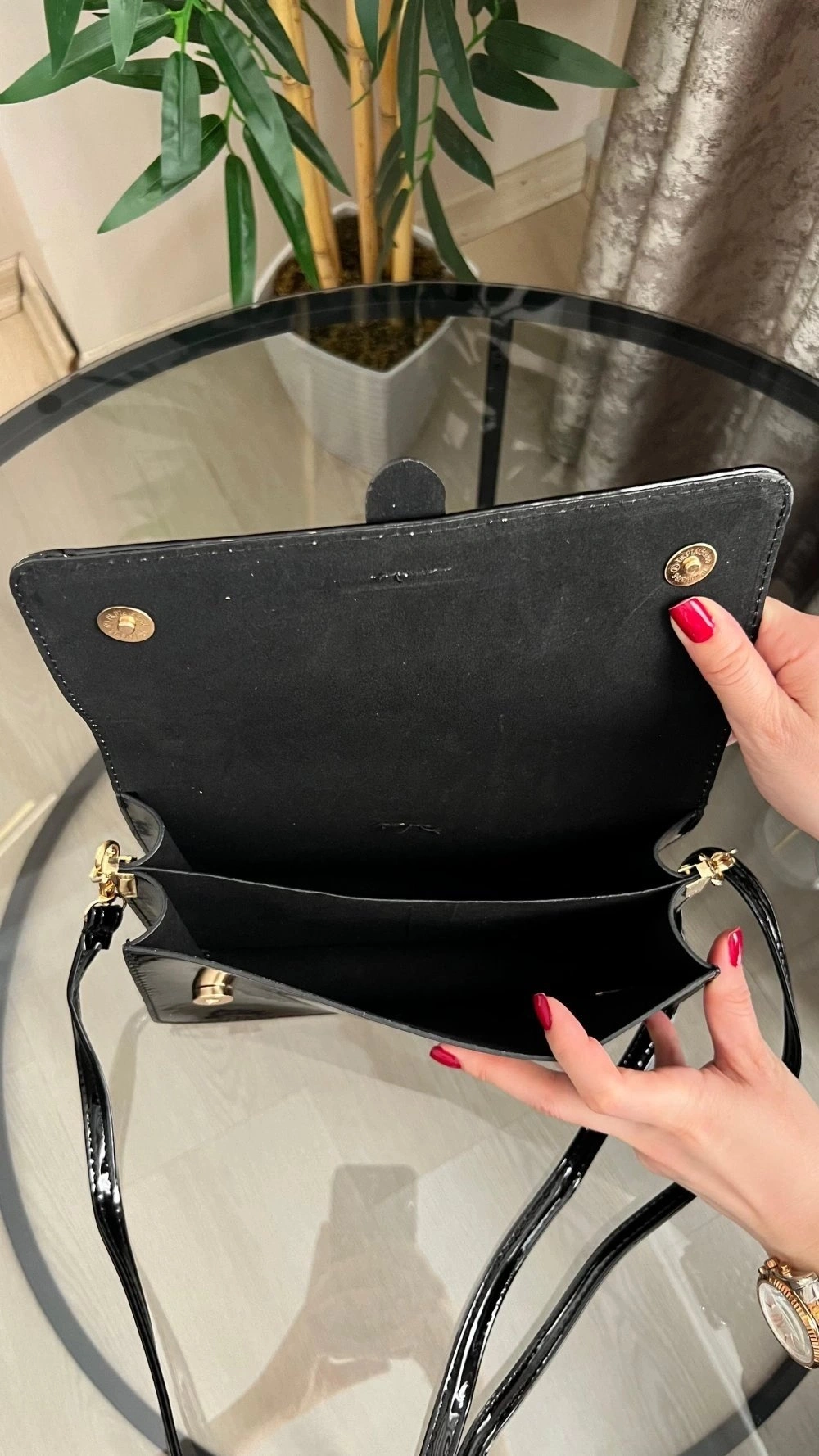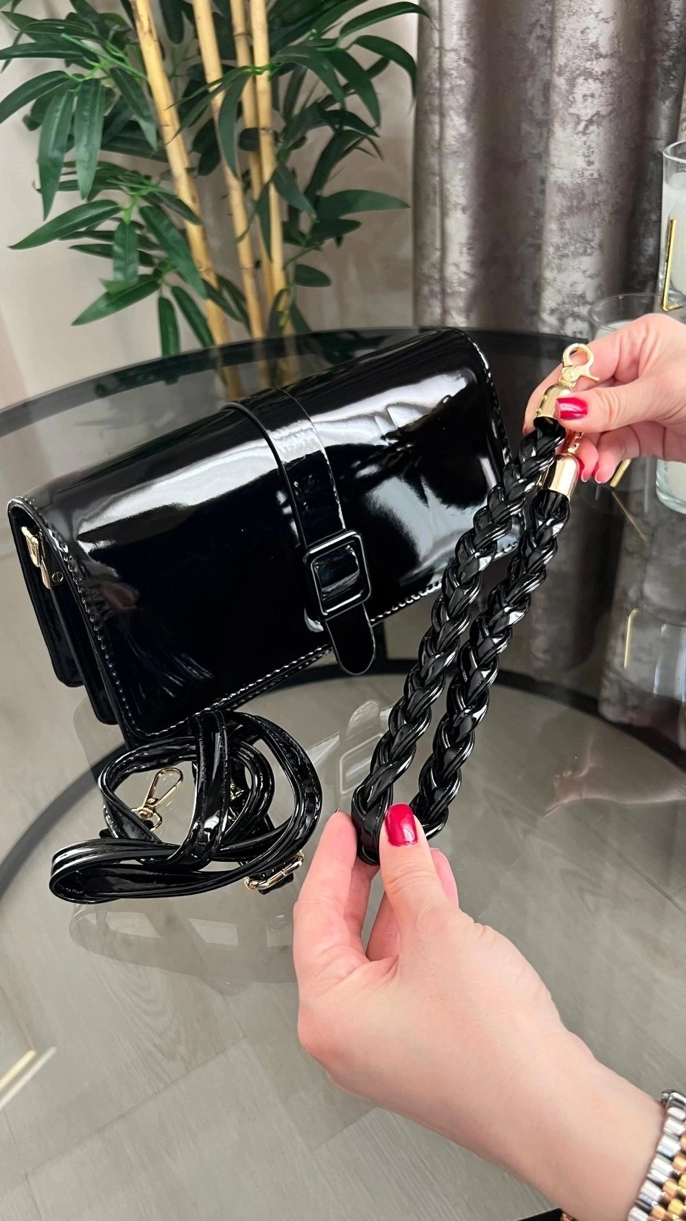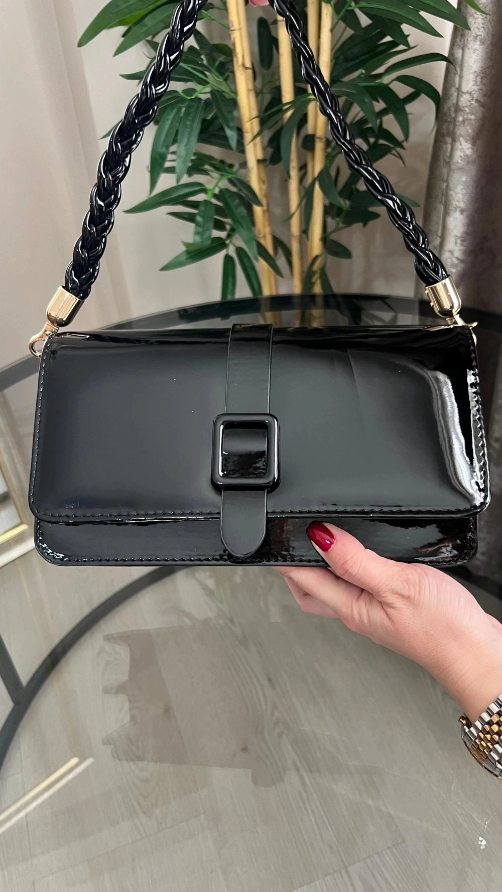 Paris Model Parlak Siyah Deri Kol Çantası
