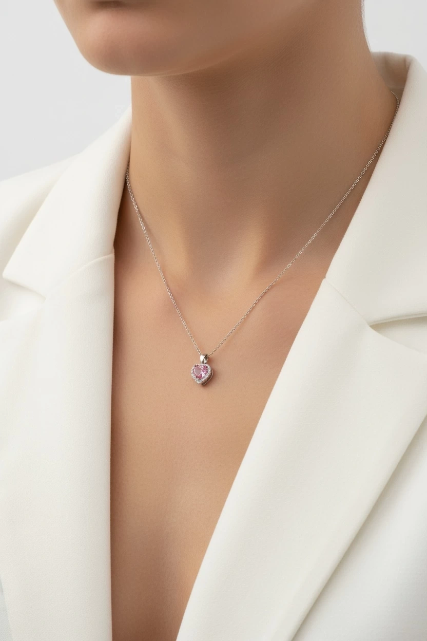 Pembe Kalp Model Beyaz Altın Kaplama Çelik Kolye