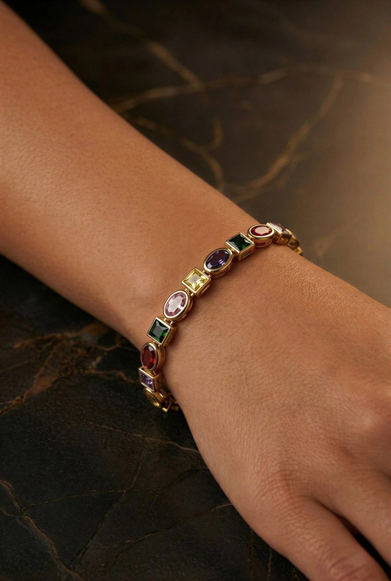 Renkli Elips Kare Model Gold Altın Kaplama Bileklik