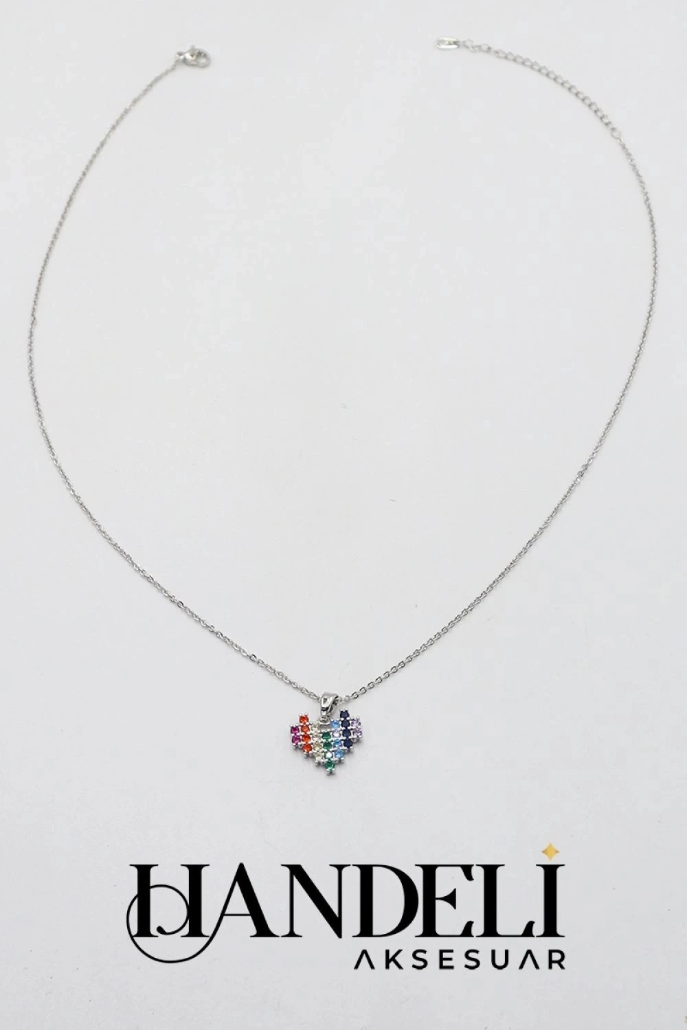 Renkli Kalp Model Beyaz Altın Kaplama Çelik Kolye