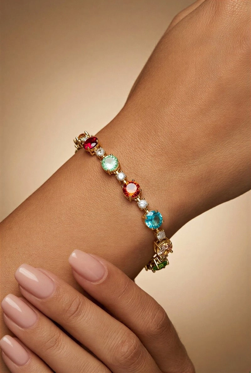 Renkli Tek Taş Model Gold Altın Kaplama Bileklik