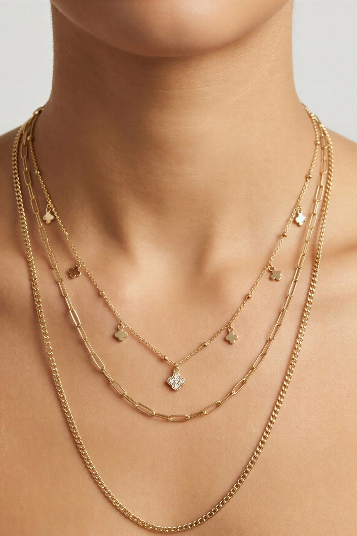Taşlı Yonca Model Gold Altın Kaplama Üçlü Kolye