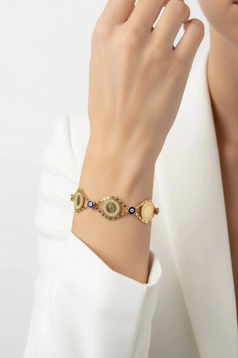 Sıralı Çeyrek Model Nazar Detay Gold Altın Kaplama Kuyum Bileklik