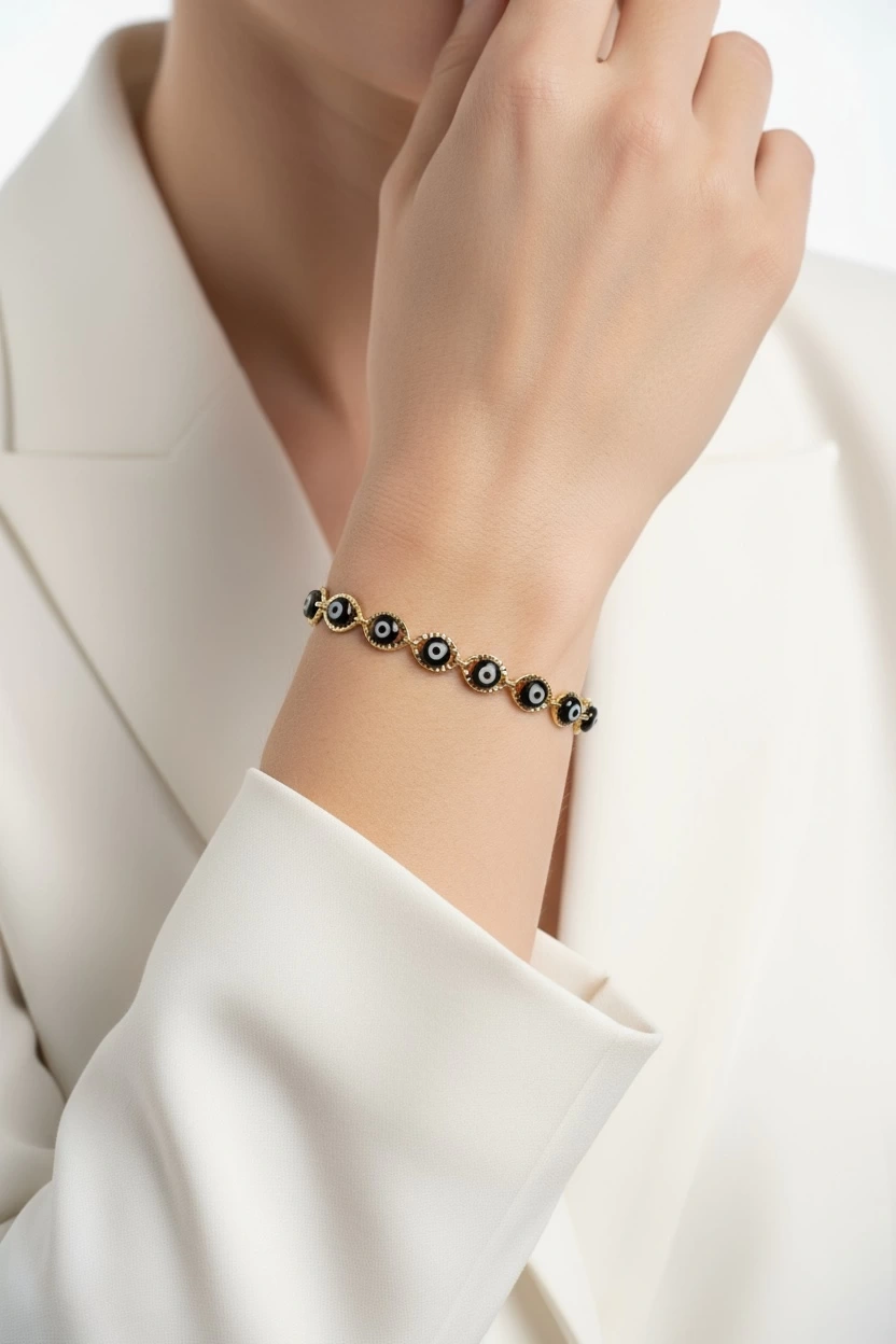 Sıralı Siyah Nazar Boncuk Detay Gold Altın Kaplama Bileklik