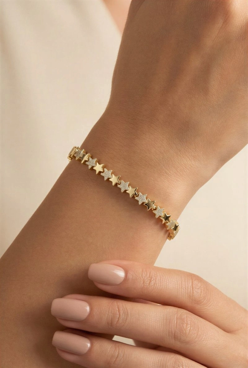 Sıralı Taş Detay Yıldız Model Gold Altın Kaplama Bileklik