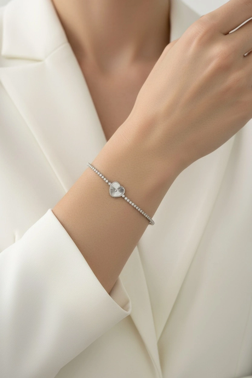 Su Yolu Model Çizgili Kalp Detay Beyaz Altın Kaplama Bileklik