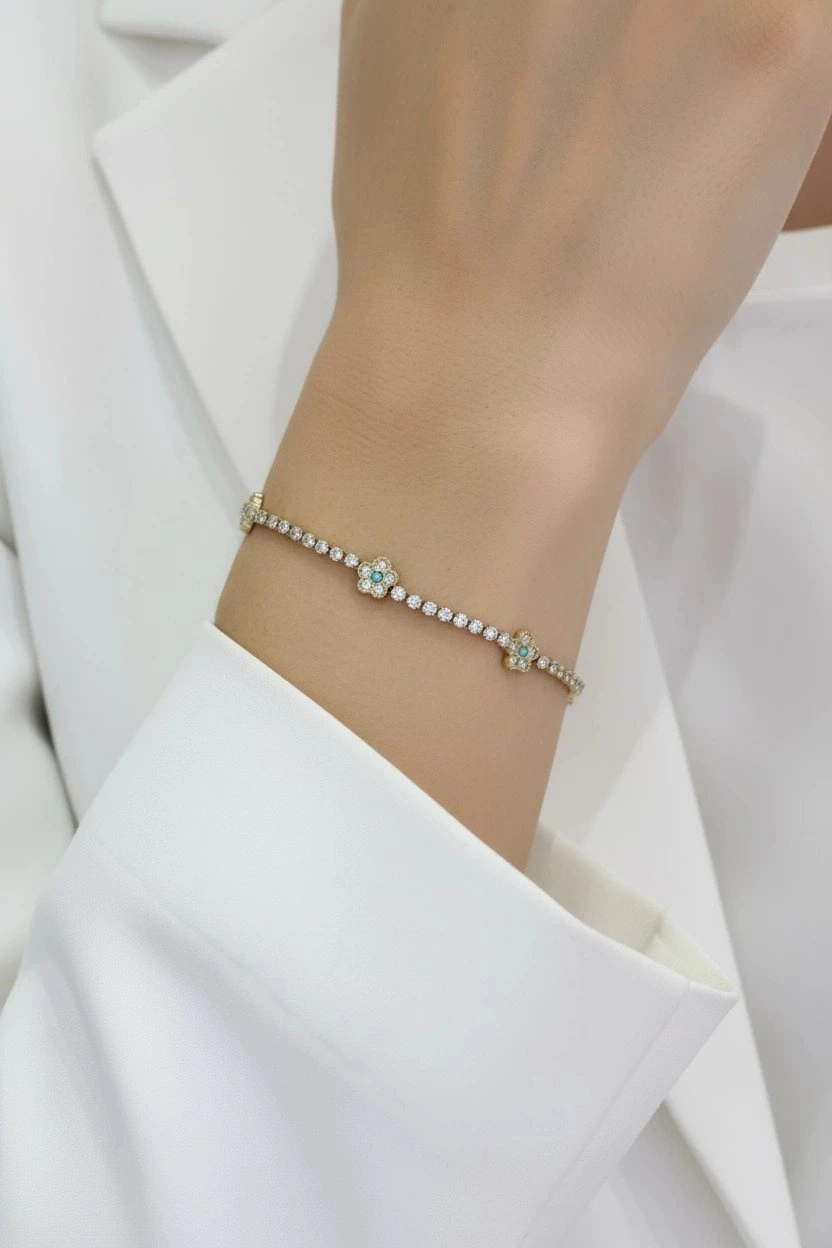 Su Yolu Model Mavi Taşlı Çiçek Detay Gold Altın Kaplama Çelik Bileklik