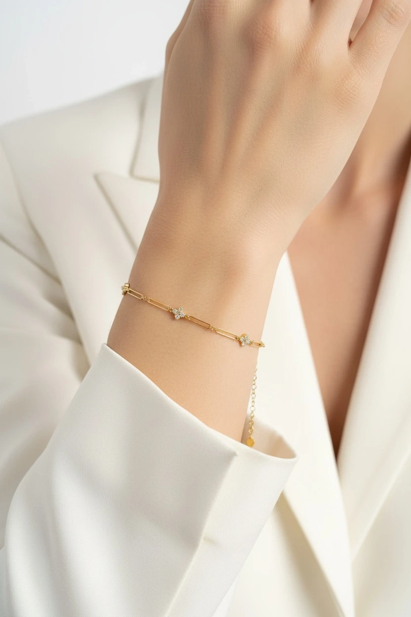 Ataç Zincir Taşlı Yonca Detay Gold Altın Kaplama Bileklik