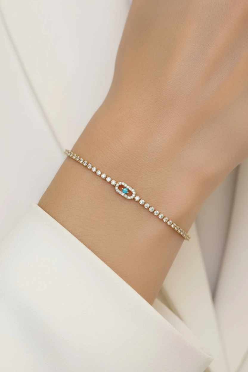 Bu şık bileklik, Su Yolu Zincir deseni ve Mavi Taş detayları ile göz kamaştırıyor. 14K altın kaplama ile özel bir parlaklık kazanan bu bileklik, hem günlük kullanıma hem de özel günlerde kombinlemek için ideal bir seçenek.