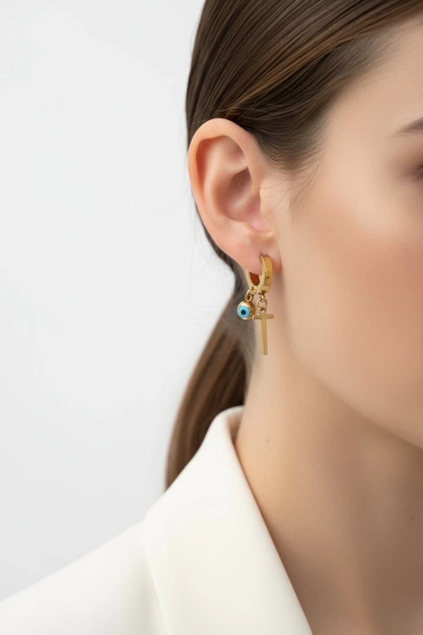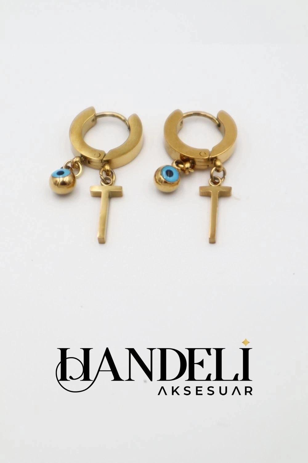 T Harf Nazar Boncuk Detay Gold Altın Kaplama Küpe