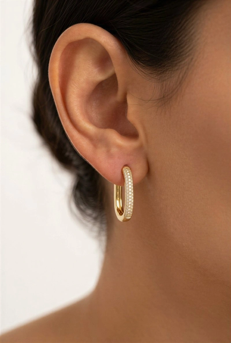 Taş Detay Elips Model Gold Altın Kaplama Küpe