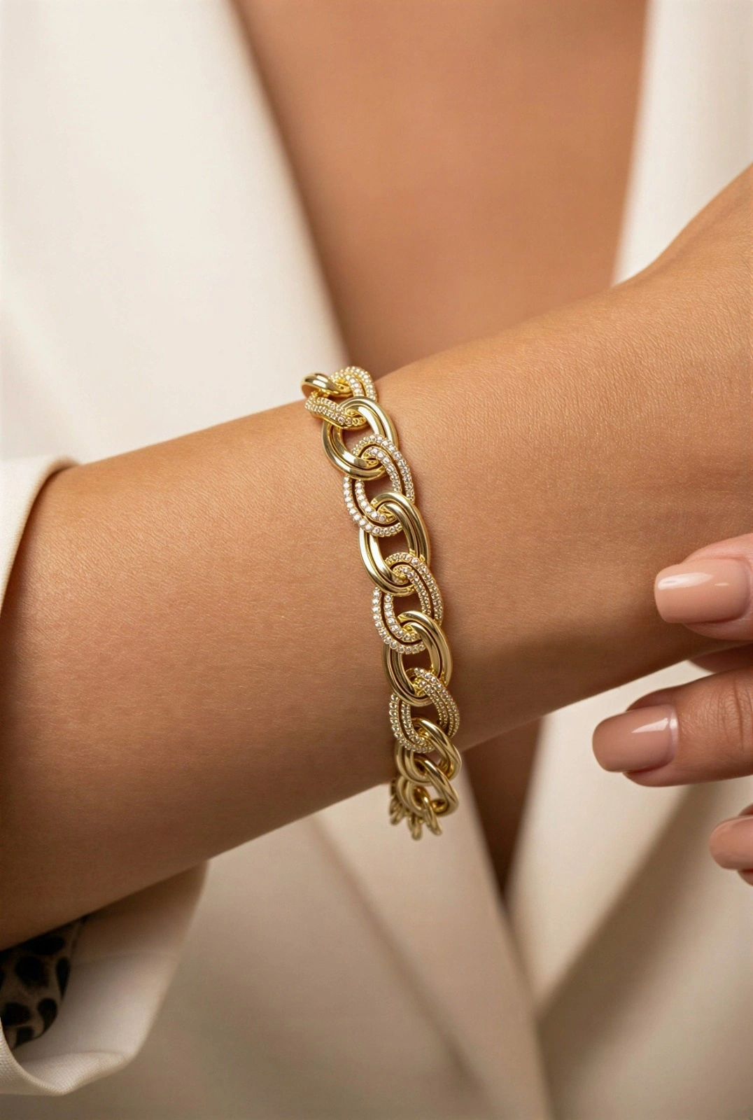 Altın Kaplama Bileklikler arasında öne çıkan Taş Detay Galaksi Model Gold Altın Kaplama Bileklik, şıklığı ve zarafeti bir arada sunuyor. Tasarımındaki detaylar ile dikkat çeken bu bileklik, 14K altın kaplama özelliği ile de kalitesini ortaya koyuyor.