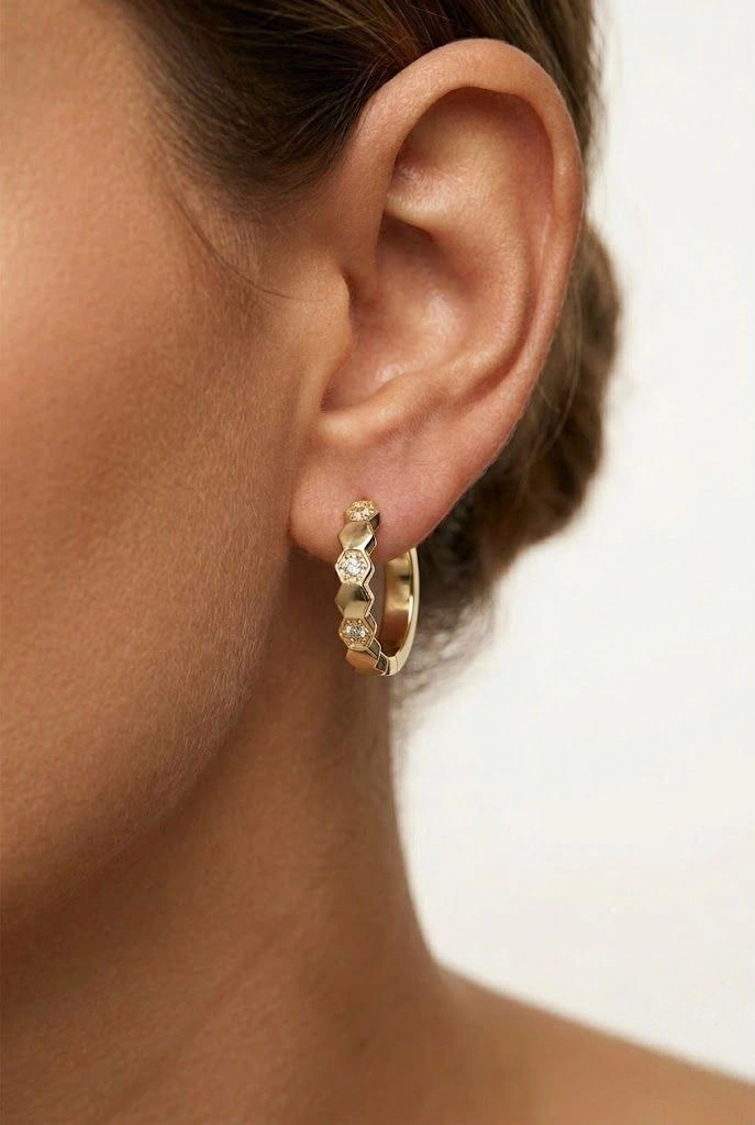Taşlı Altıgen Model Gold Altın Kaplama Küpe