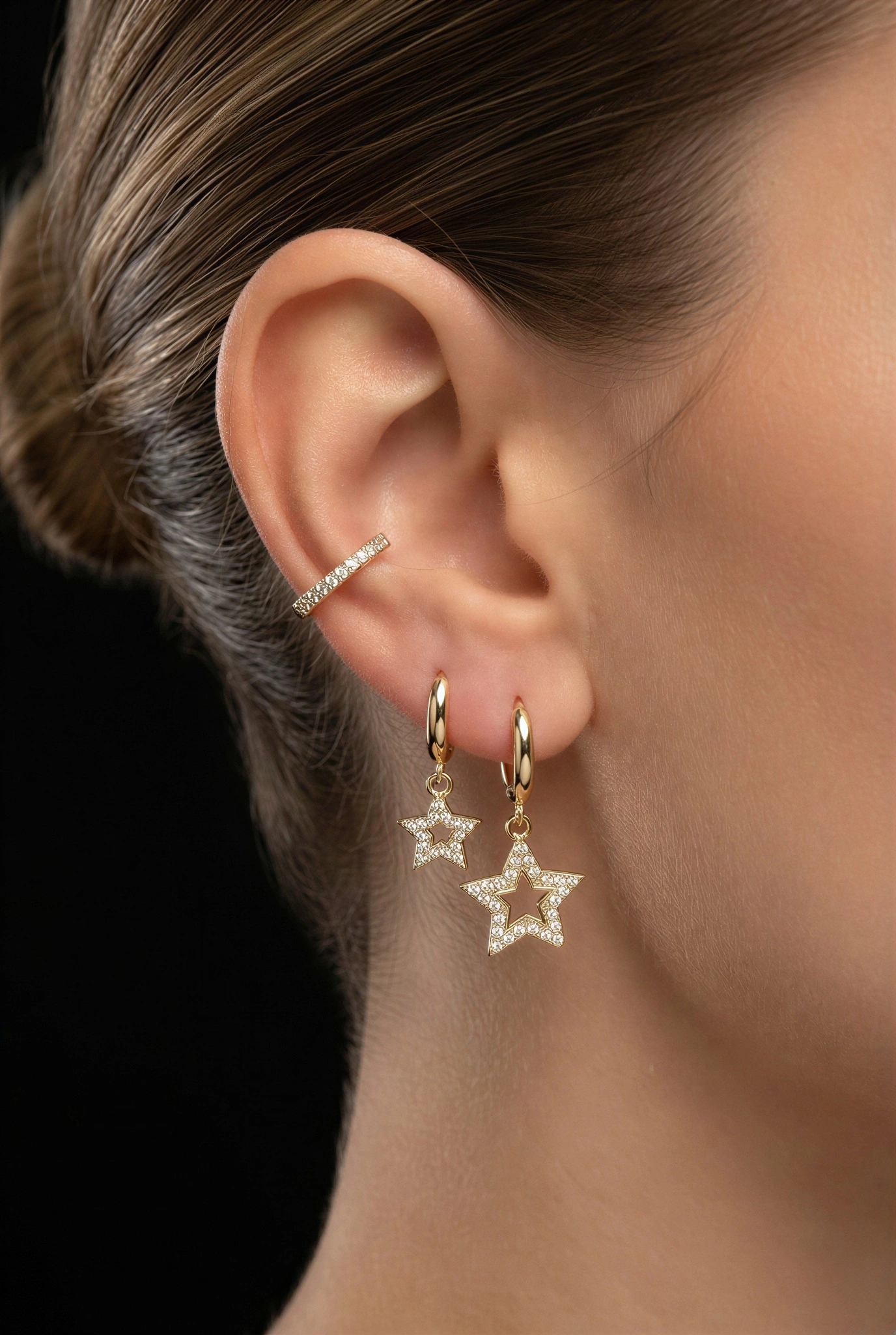 Çift Yıldız Model Gold Altın Kaplama Üçlü Küpe