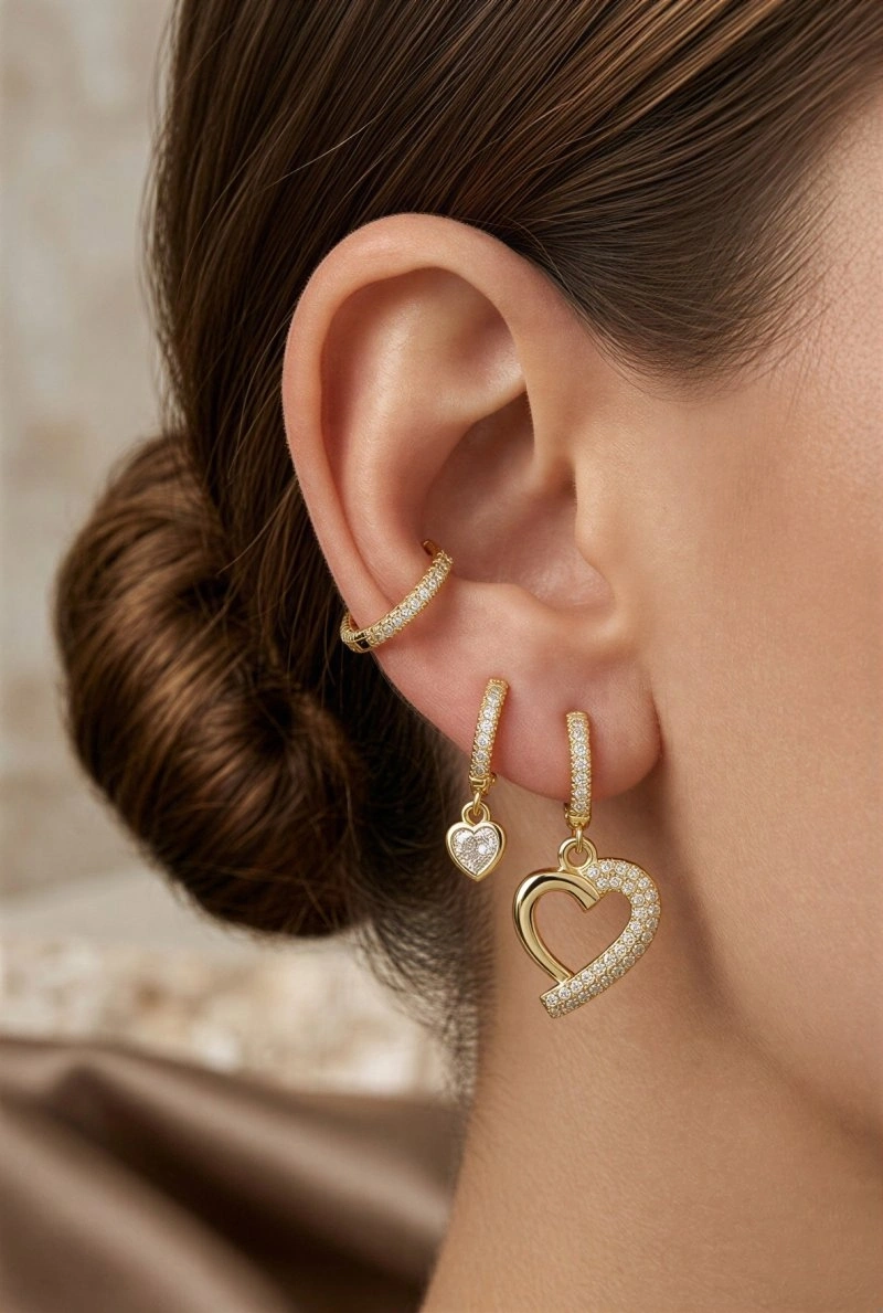 Taşlı Kalp Model Gold Altın Kaplama Üçlü Küpe