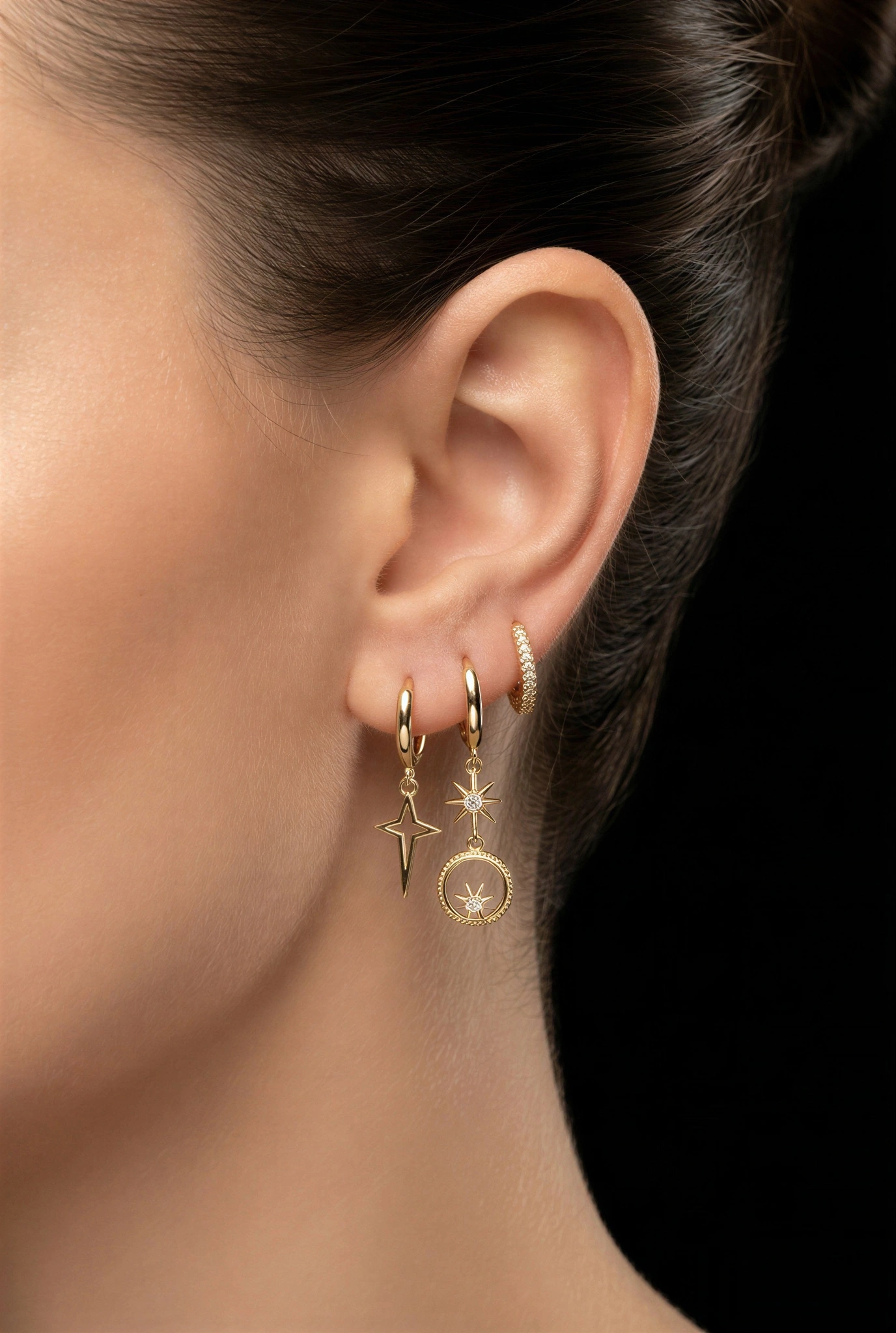 Kuzey Yıldızı Halka Model Gold Altın Kaplama Üçlü Küpe