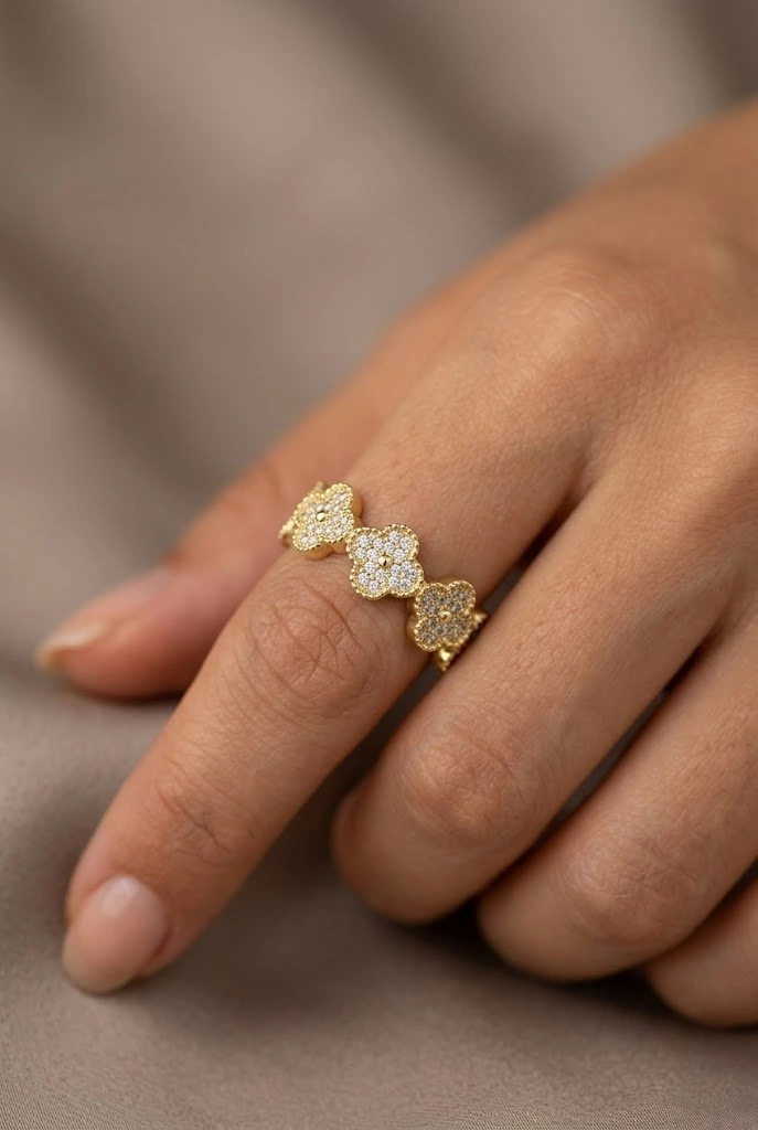 Taşlı Sıra Yonca Model Gold Altın Kaplama Ayarlanabilir Yüzük