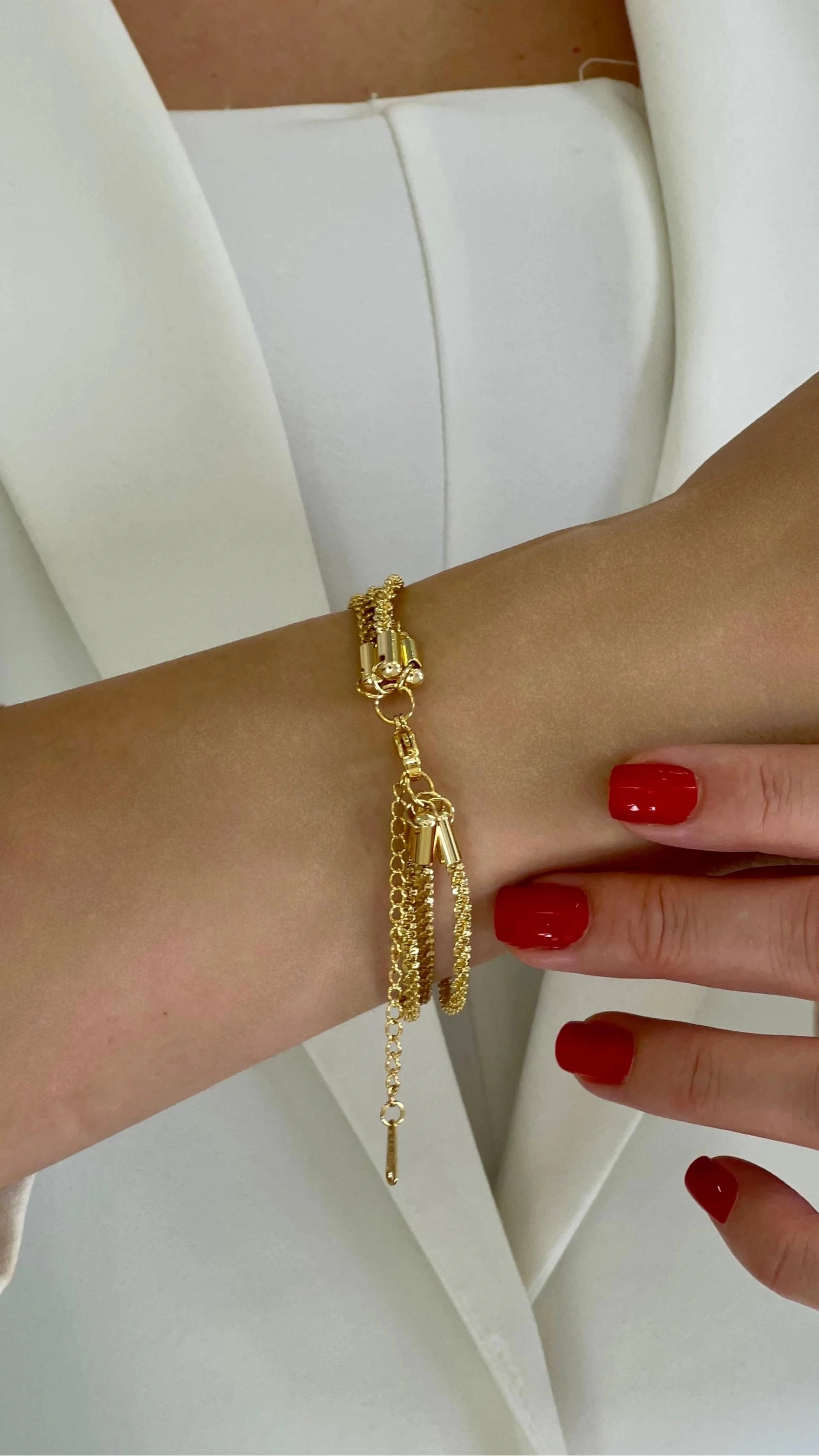 Üç Sıra Desen Detay Gold Altın Kaplama Çelik Bileklik, hem şıklığı hem de dayanıklılığı bir arada sunarak kullanıcılarına benzersiz bir deneyim yaşatır.