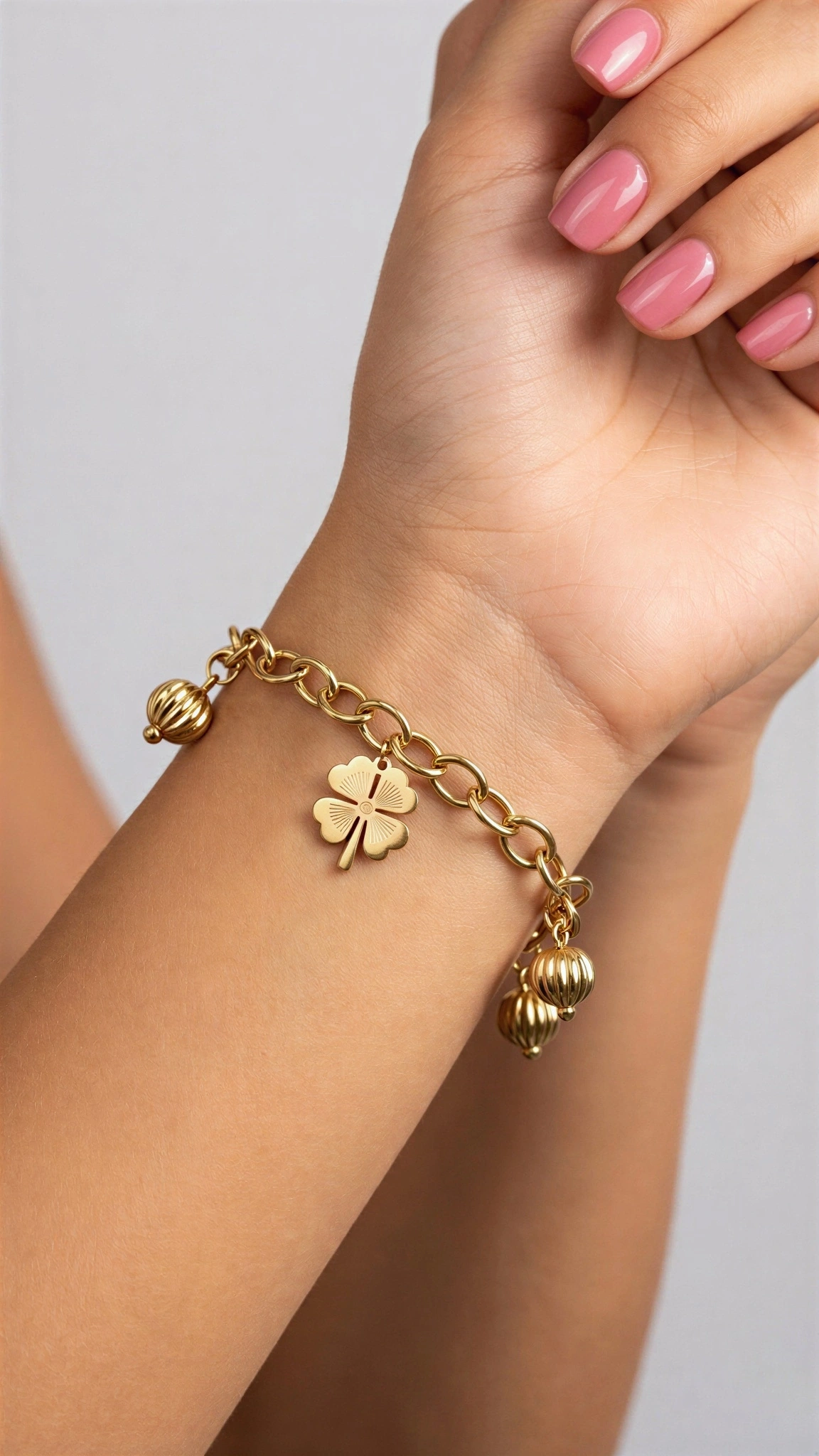 İnce Zincir Sarkıt Yonca Model Gold Altın Kaplama Çelik Bileklik