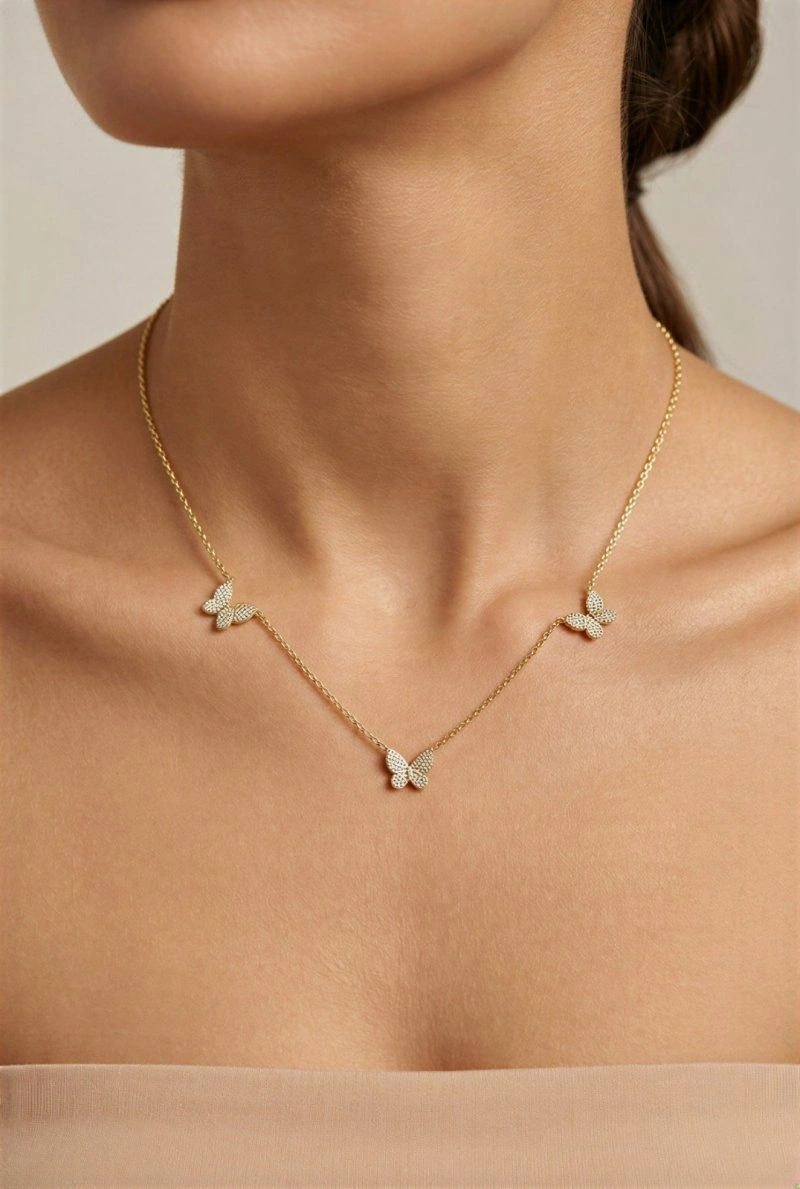 Üçlü Kelebek Model Zarif Gold Altın Kaplama Kolye
