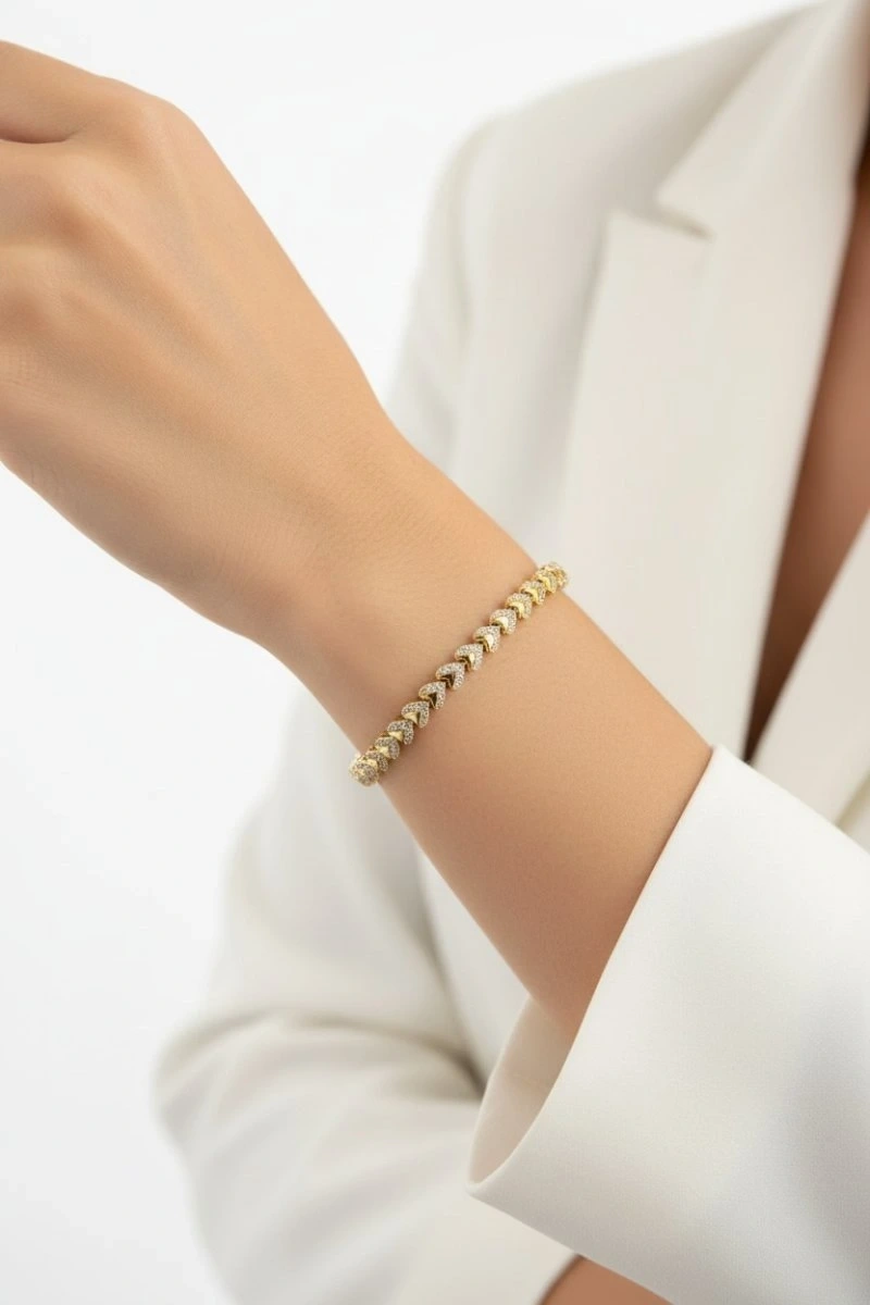 Uzatmalı Sıralı Taş Detay Kalp Model Gold Altın Kaplama Bileklik