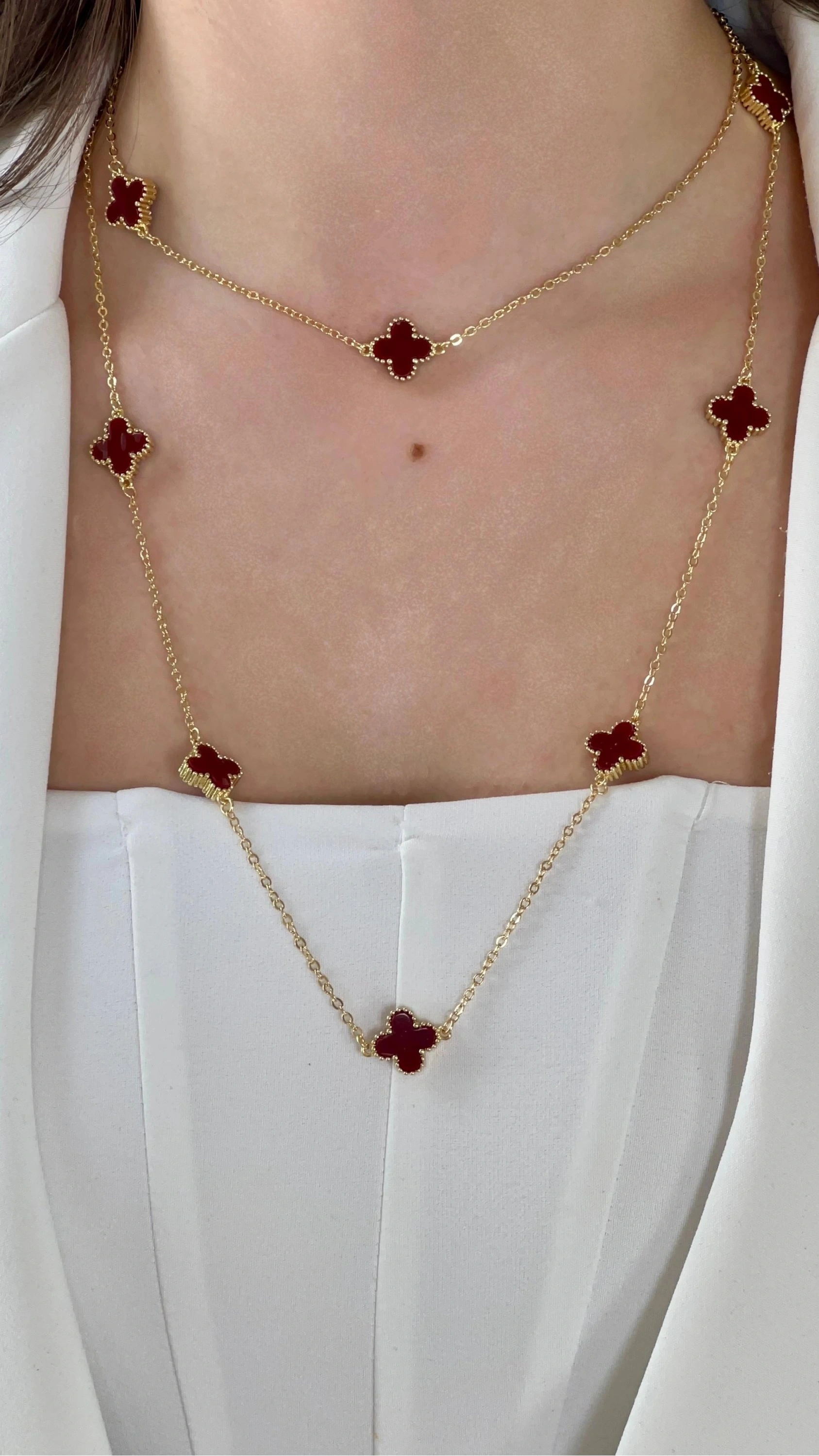 Uzun Bordo Yonca Detay Gold Altın Kaplama Kolye