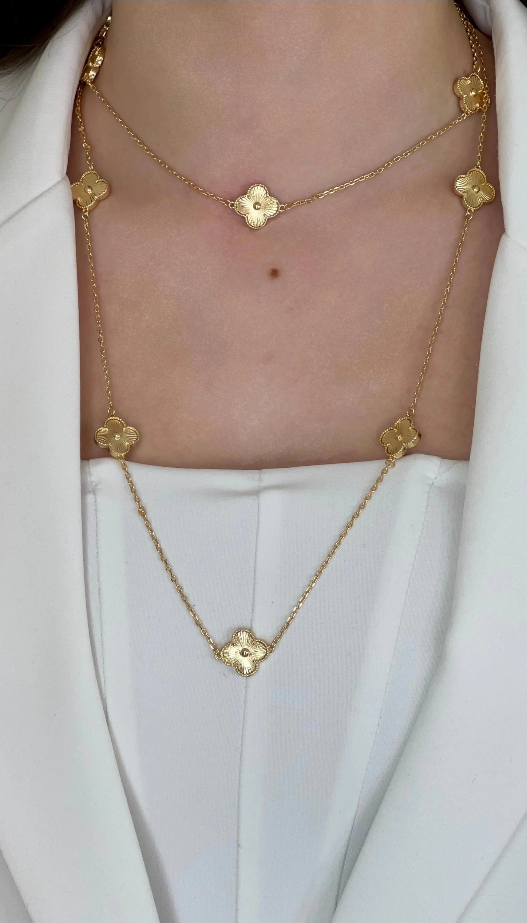 Uzun Nokta Desen Yonca Detay Gold Altın Kaplama Kolye, şıklığı ve zarifliği bir arada sunar. Bu kolye ile her kombininize şık bir dokunuş ekleyebilirsiniz.