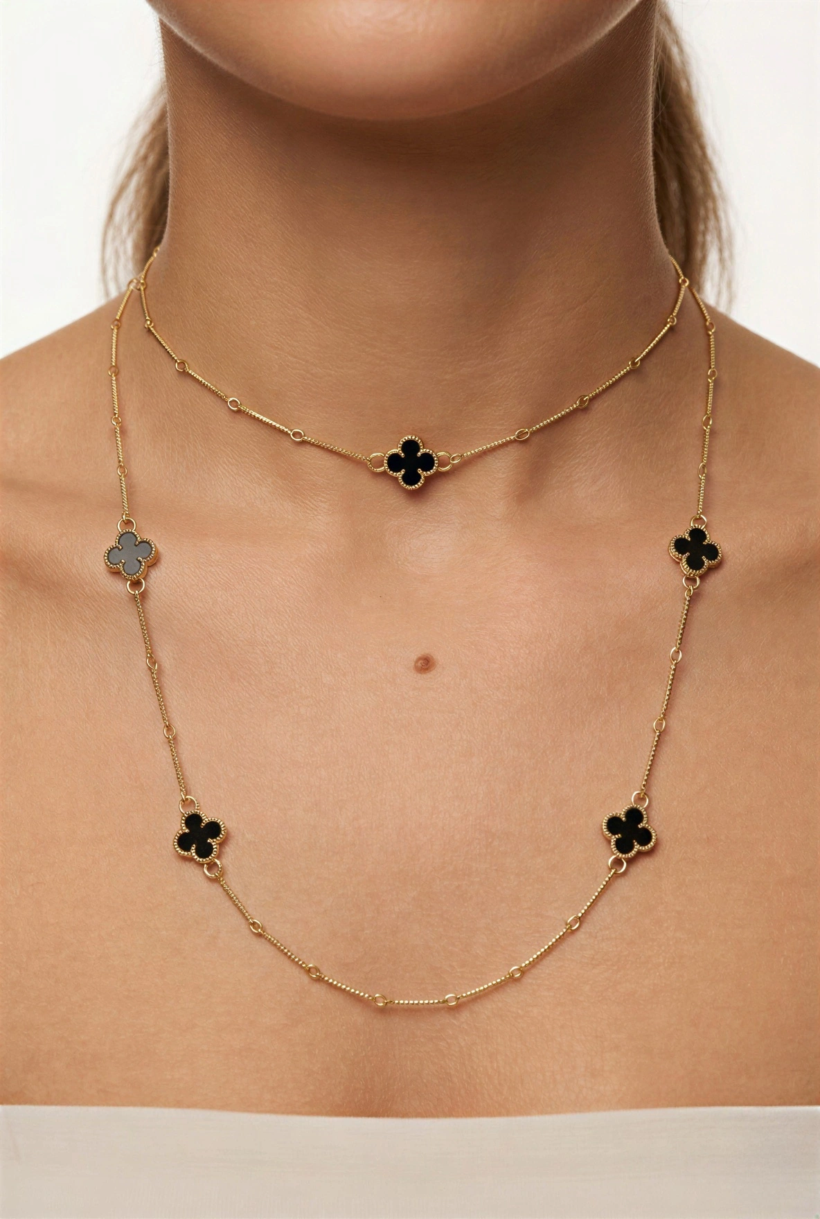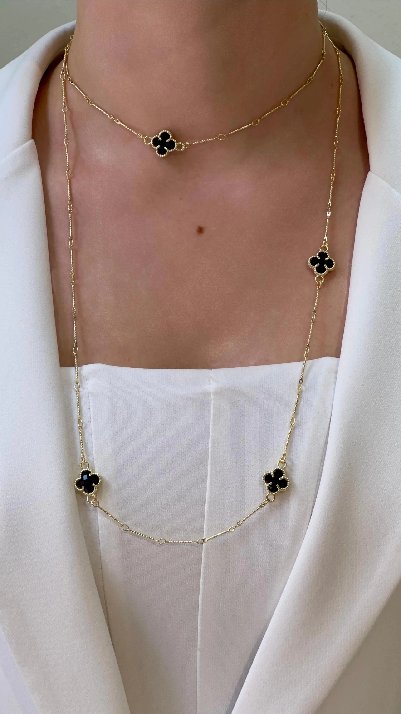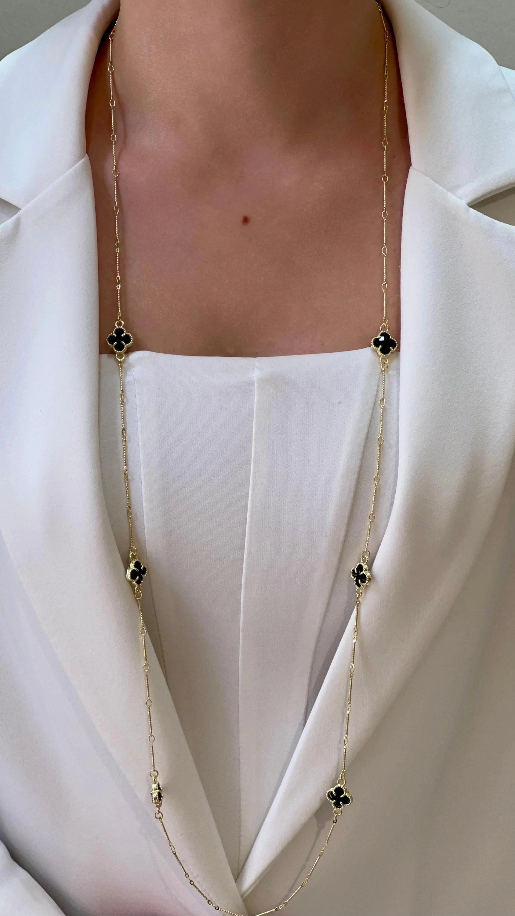 Uzun Siyah Yonca Model Gold Altın Kaplama Kolye