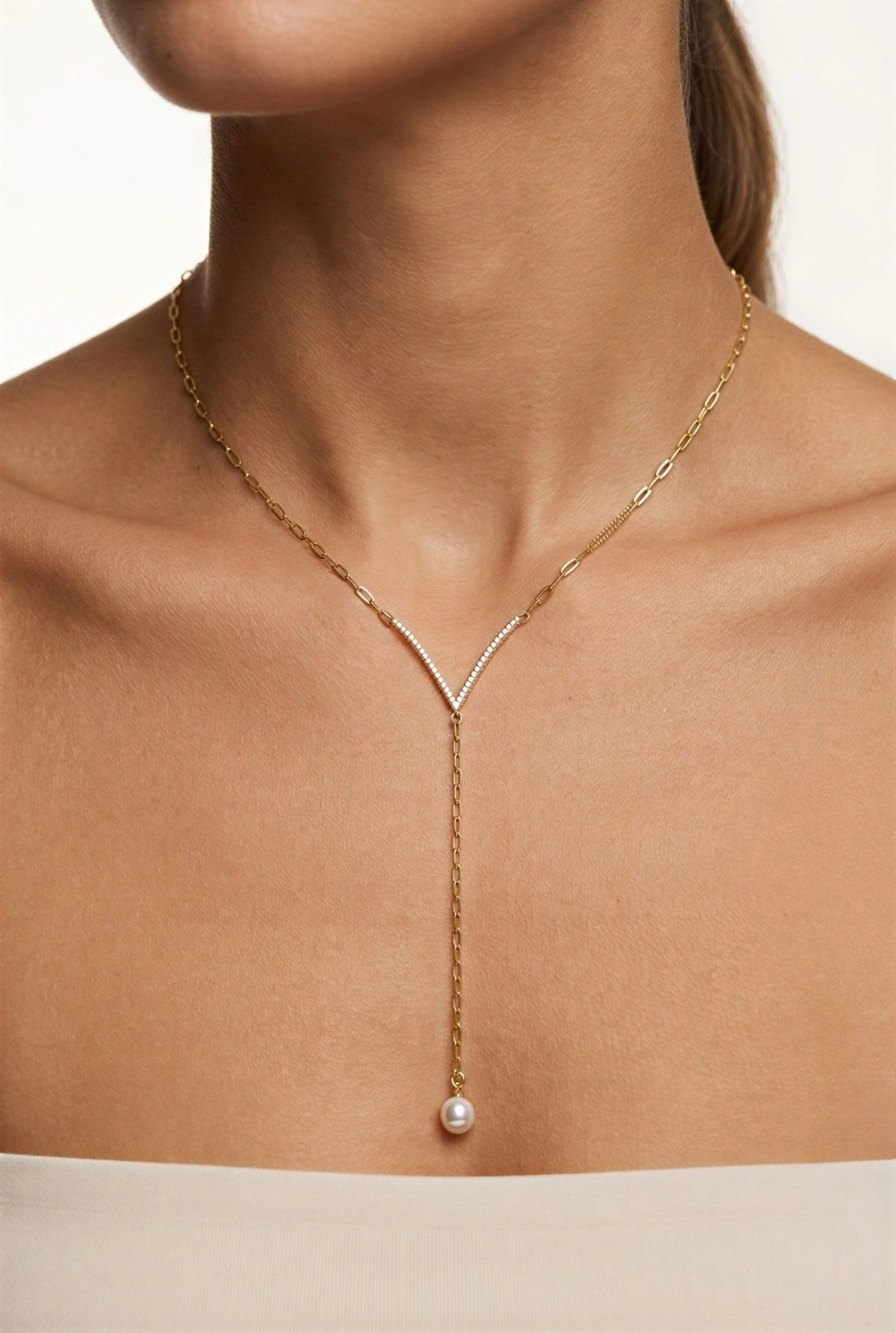 V Model İnci Sarkıt Detay Gold Altın Kaplama Kolye