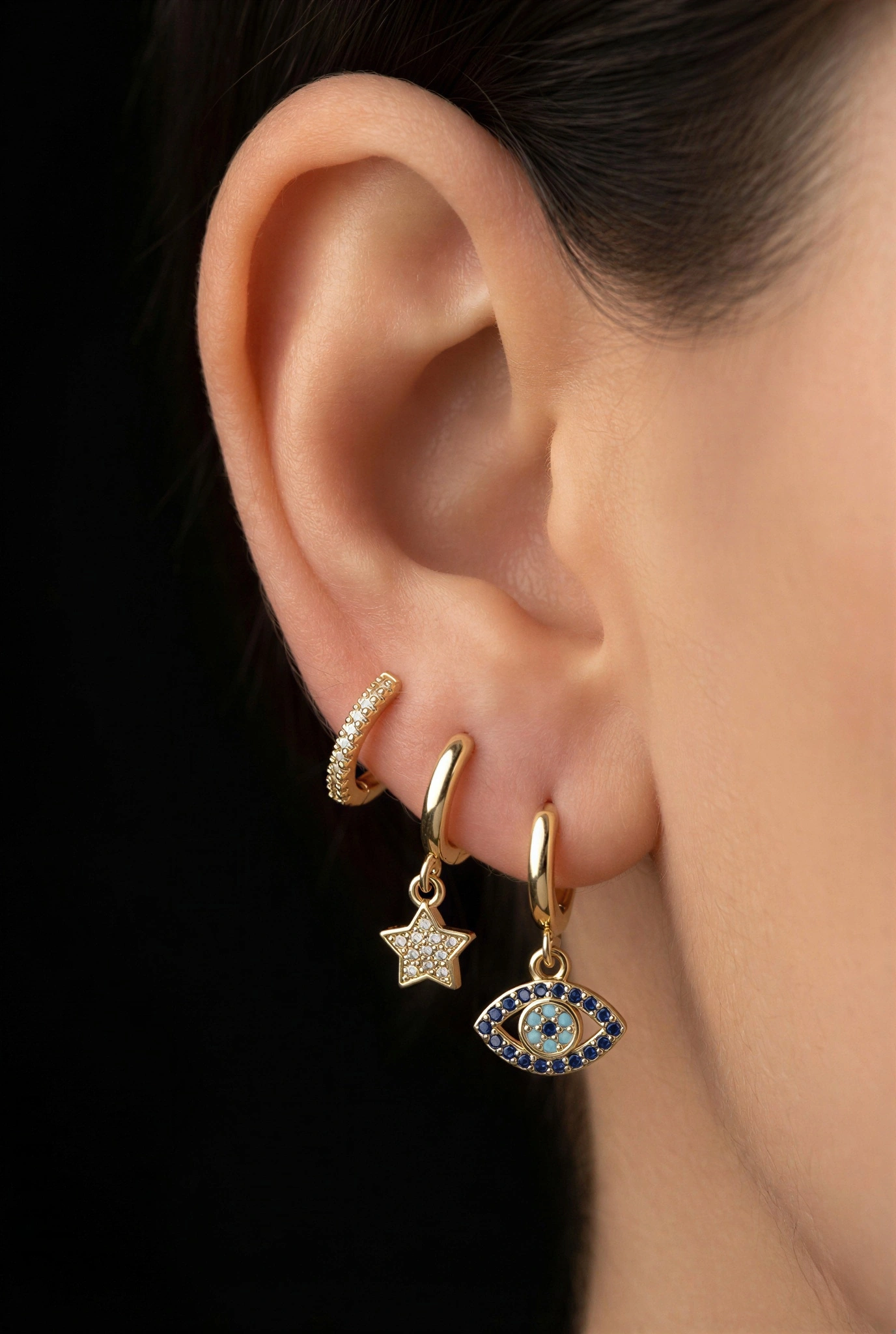 Taşlı Göz Model Gold Altın Kaplama Üçlü Küpe
