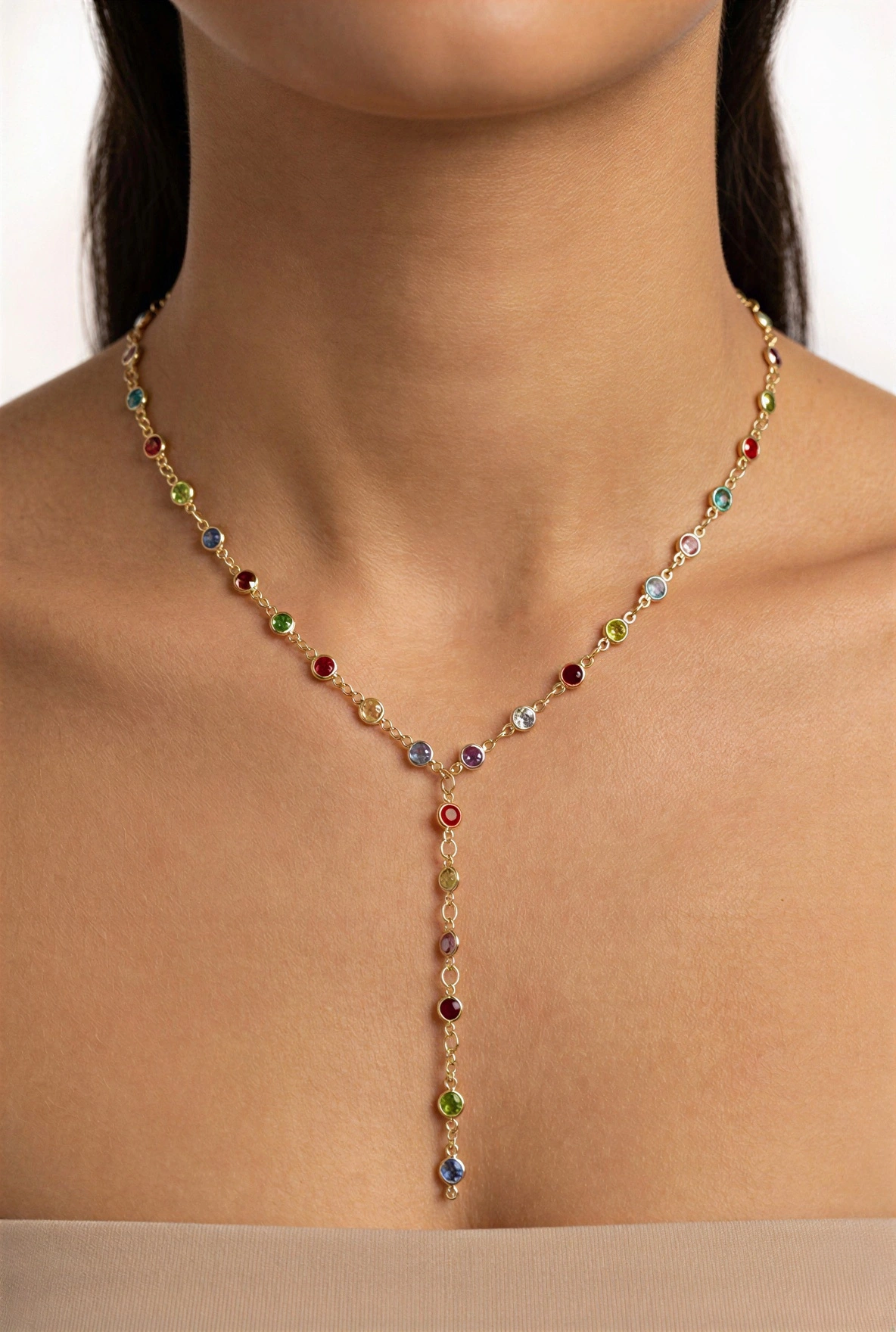 Y Model Renkli Taş Detay Gold Altın Kaplama Kolye, şıklığı ve zarifliği bir arada sunar. Bu özel tasarım kolye, 14K altın kaplama ile üretilmiştir ve uzun süre parlaklığını korur.