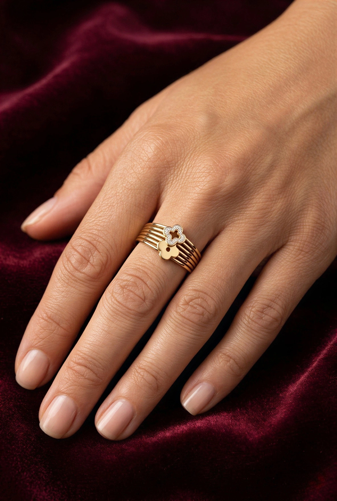 Yarım Yonca Taş Detay Gold Altın Kaplama Çelik Yüzük