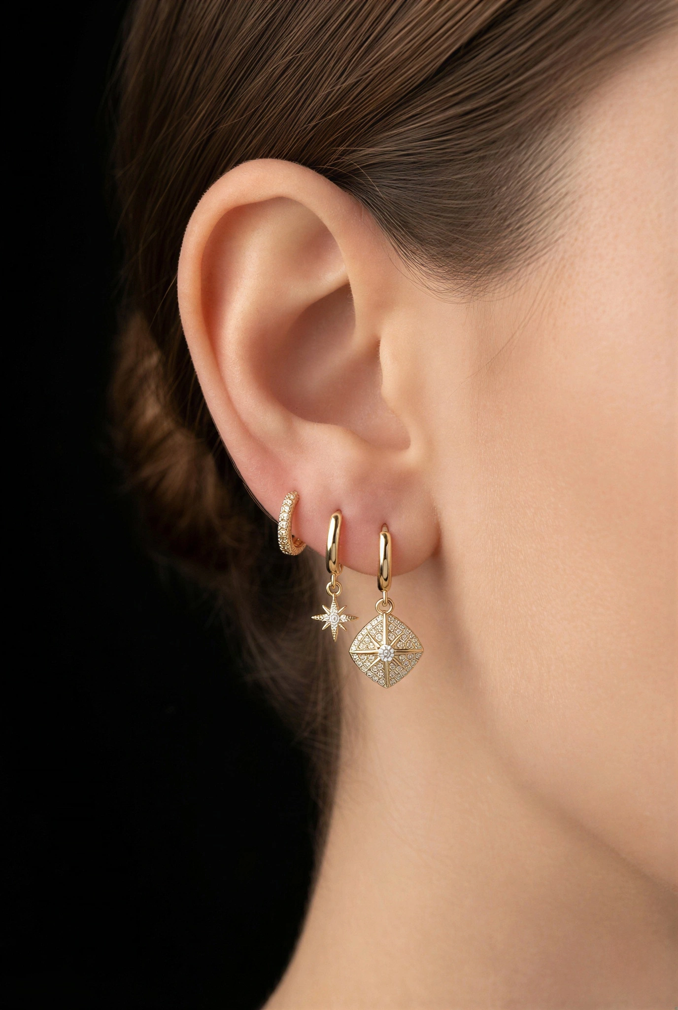 Köşeli Yıldız Model Gold Altın Kaplama Üçlü Küpe