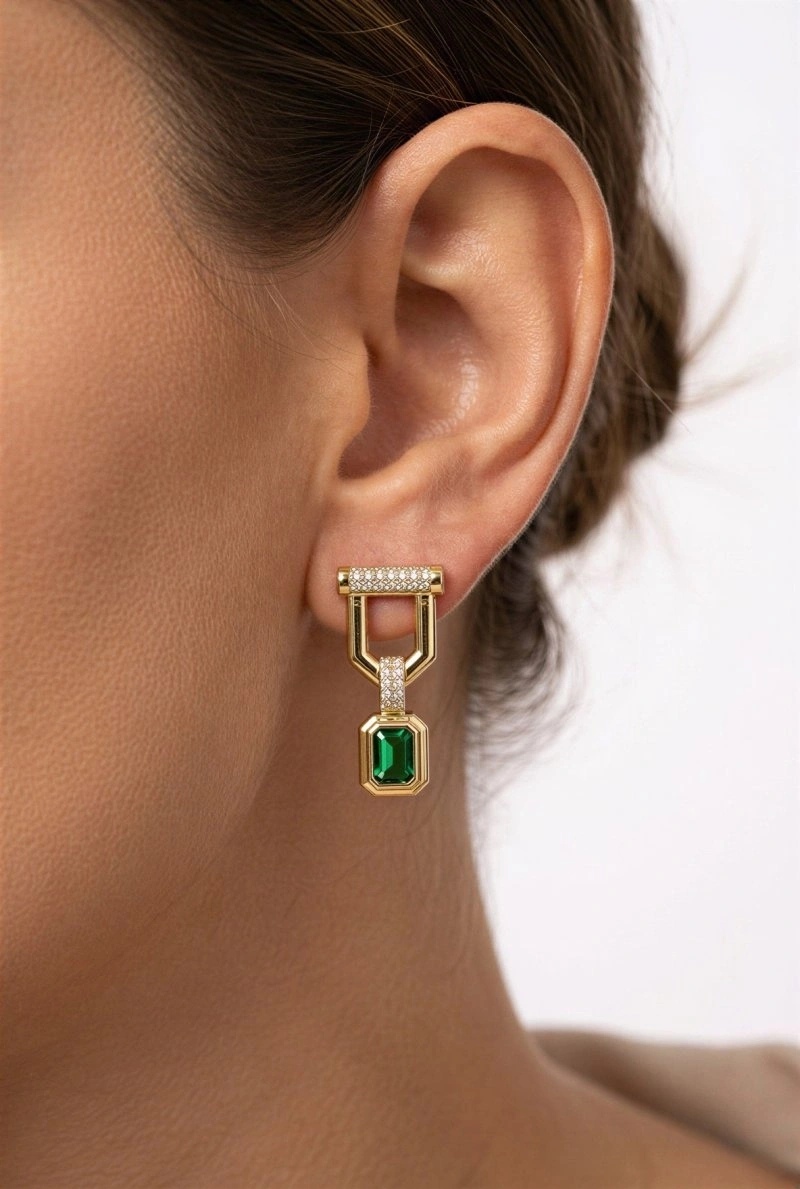 Yeşil Renk Model Gold Altın Kaplama Küpe
