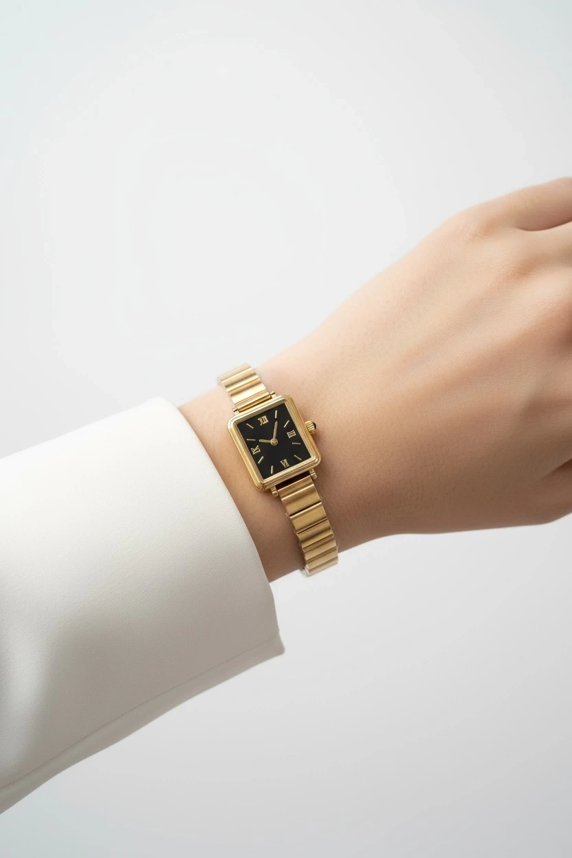 Çizgili Gold Kordon Detay Kare Siyah Kadran Model Kadın Kol Saati