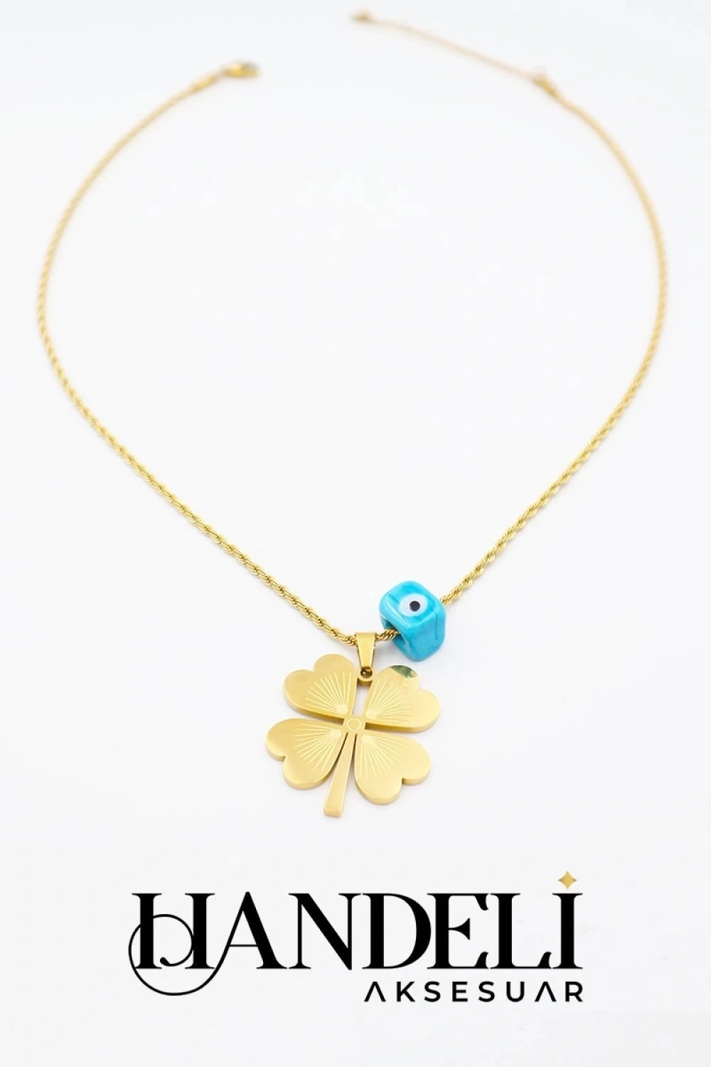 Yonca Model Boncuklu Kısa Burgu Gold Altın Kaplama Kolye